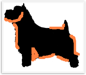 The areas indicated in orange usually require the most attention and it is these areas that really reinforce the correct silhouette of the breed. Remove the untidy hair as necessary.